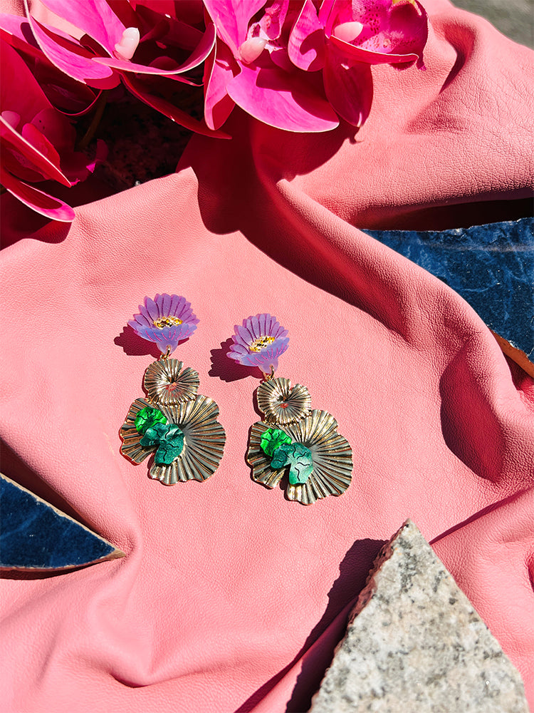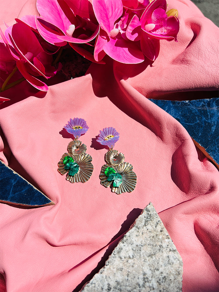 Our pieces are handcrafted from a range of mixed materials; hand poured resin, hand painted acrylics, matte silk finish acrylics, mineral acrylics, mirror, freshwater pearls, beads, faux leather tassels, silk tassels, brass, 18k gold plating.