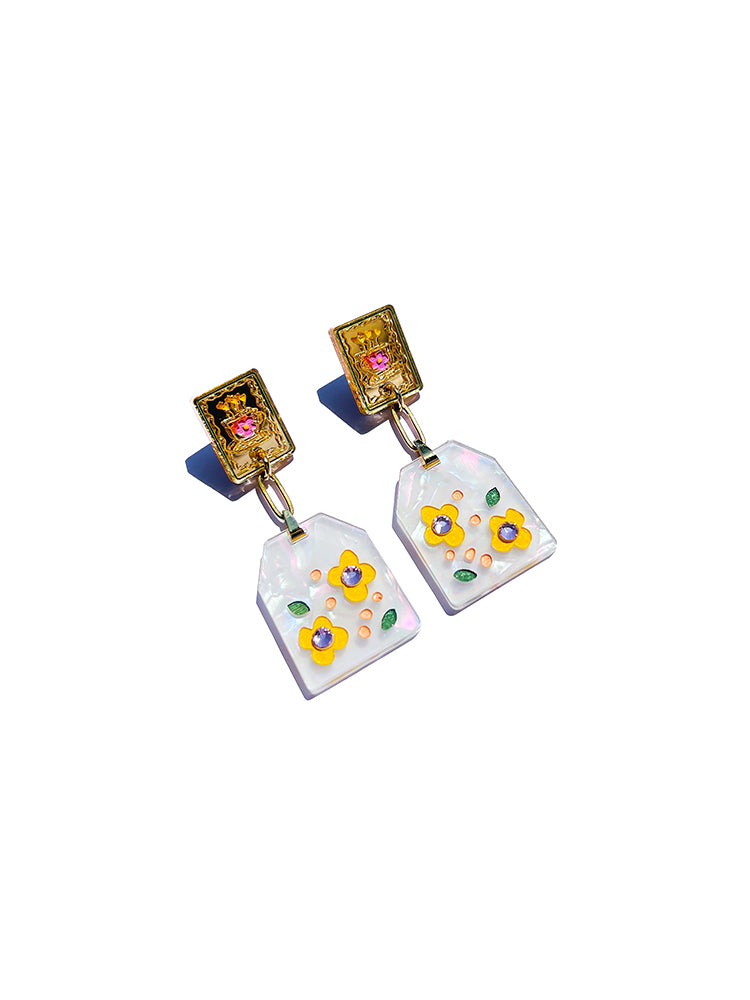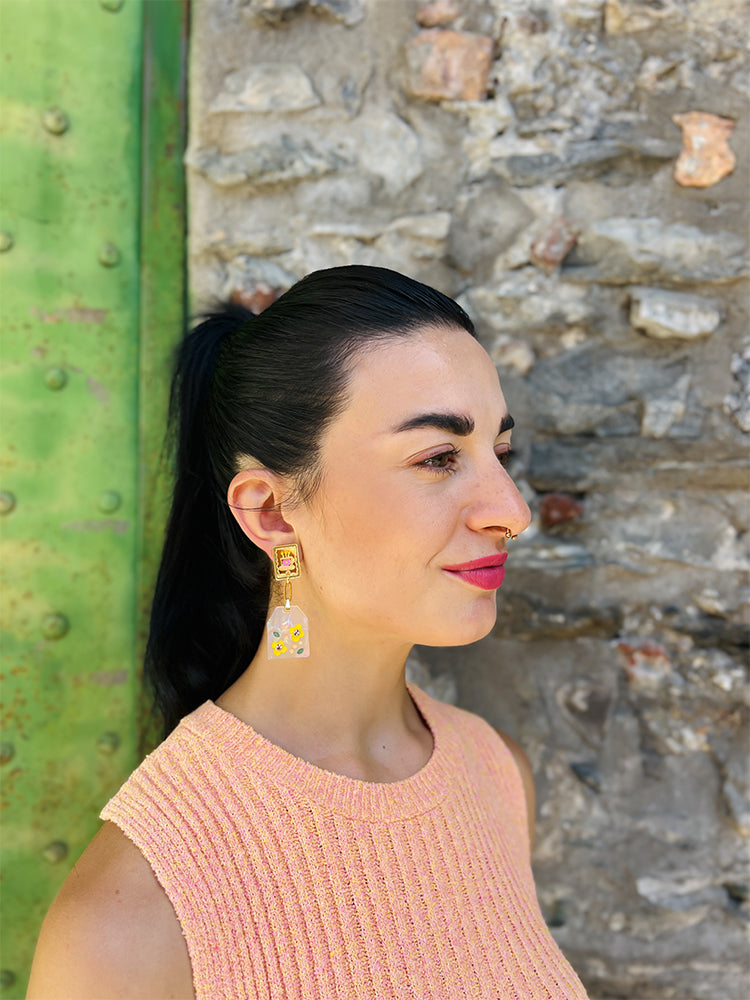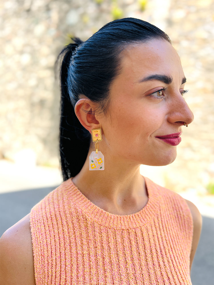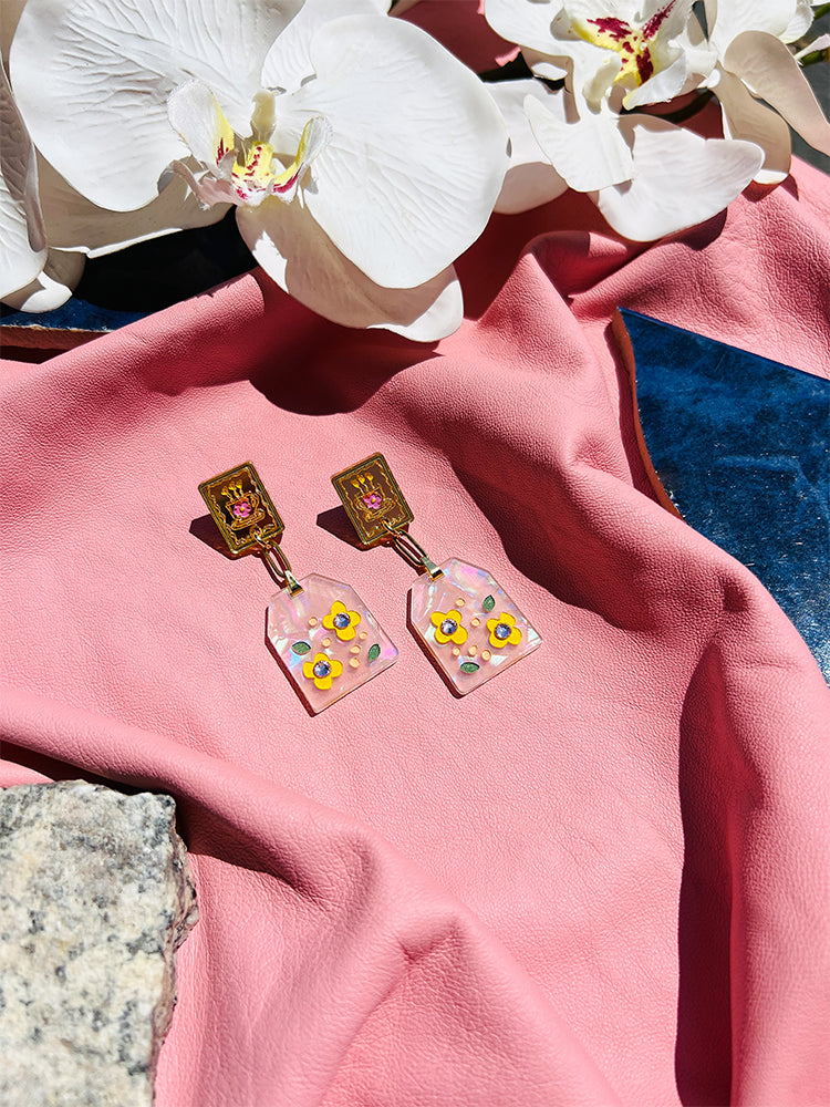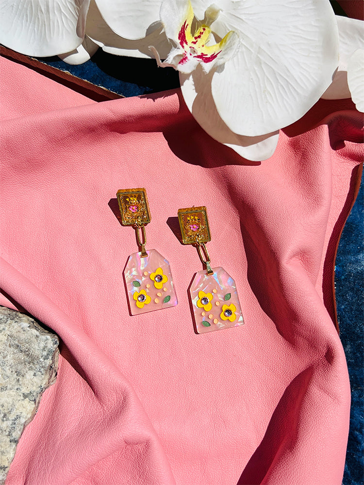Our pieces are handcrafted from a range of mixed materials; hand poured resin, hand painted acrylics, matte silk finish acrylics, mineral acrylics, mirror, freshwater pearls, beads, faux leather tassels, silk tassels, brass, 18k gold plating.