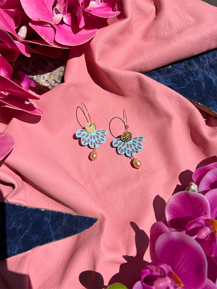 Made from handprinted matte finish plastic, acrylic mirror and freshwater pearl. Hypoallergenic gold stainless steel earring hoop.
