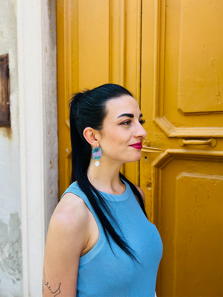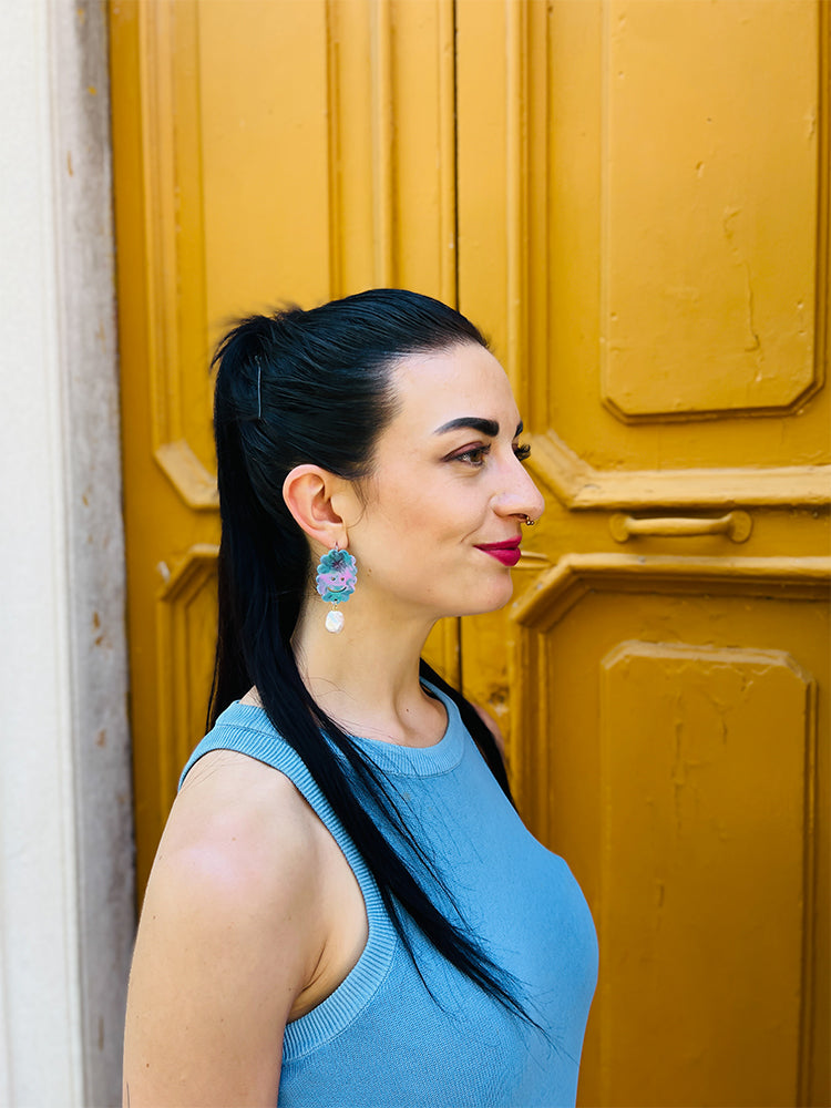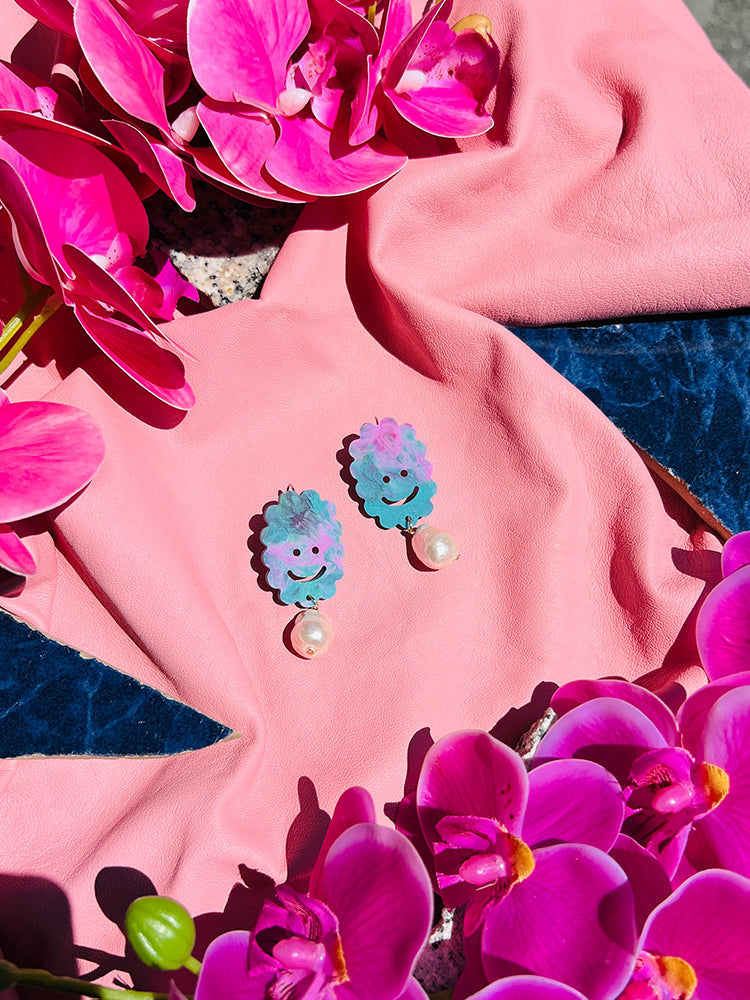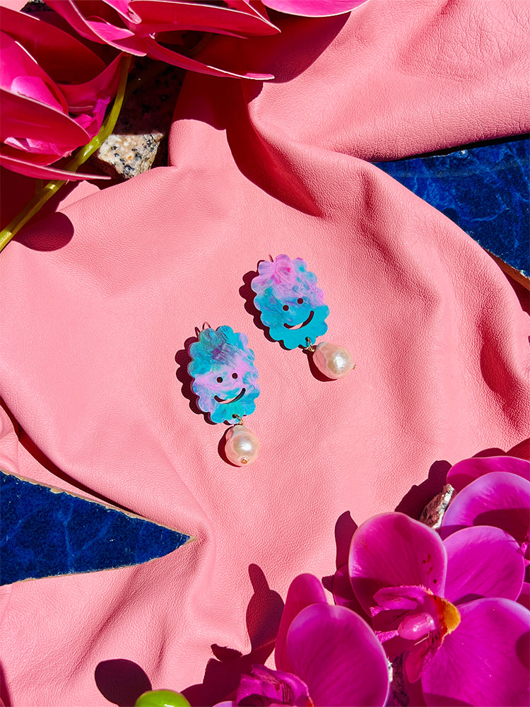 Our pieces are handcrafted from a range of mixed materials; hand poured resin, hand painted acrylics, matte silk finish acrylics, mineral acrylics, mirror, freshwater pearls, beads, faux leather tassels, silk tassels, brass, 18k gold plating.