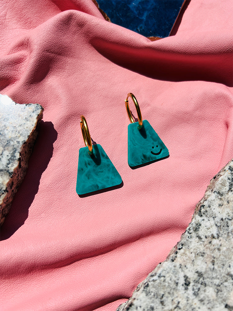 Our pieces are handcrafted from a range of mixed materials; hand poured resin, hand painted acrylics, matte silk finish acrylics, mineral acrylics, mirror, freshwater pearls, beads, faux leather tassels, silk tassels, brass, 18k gold plating.