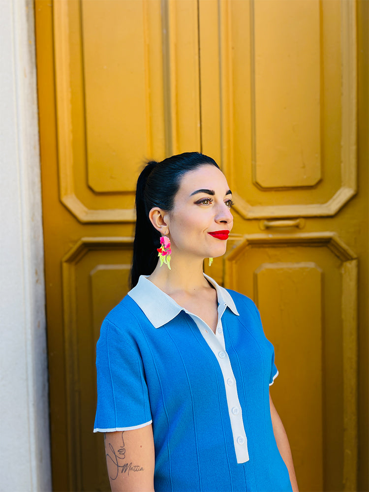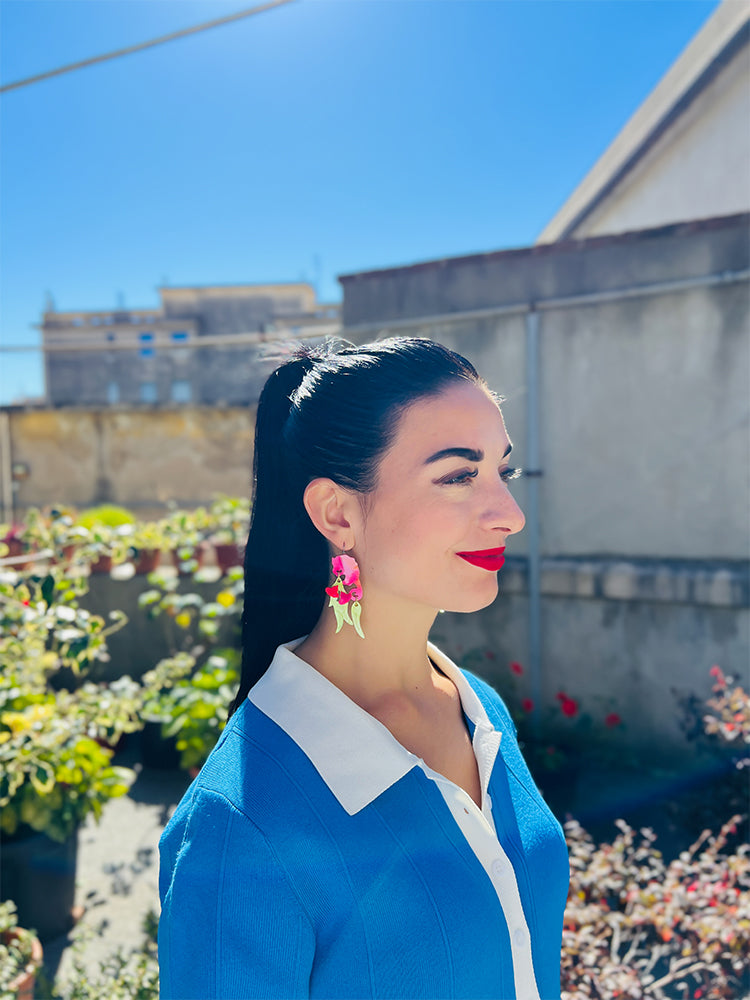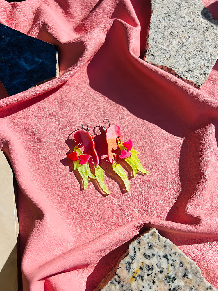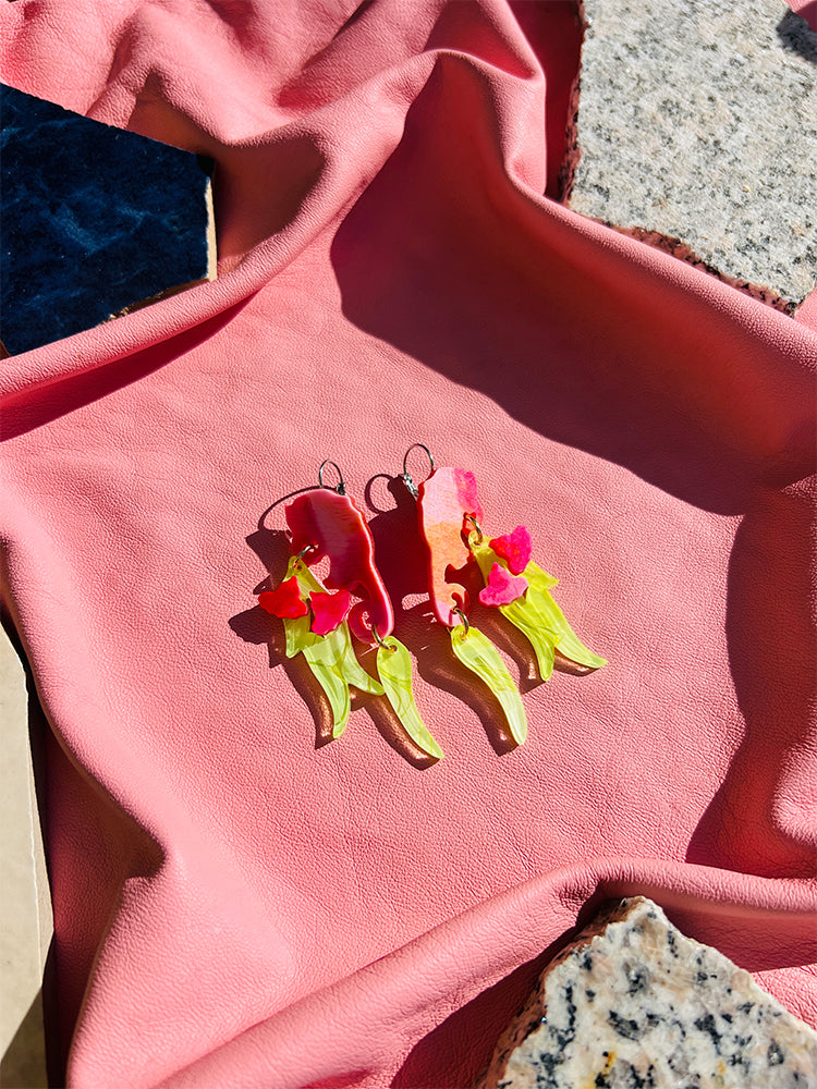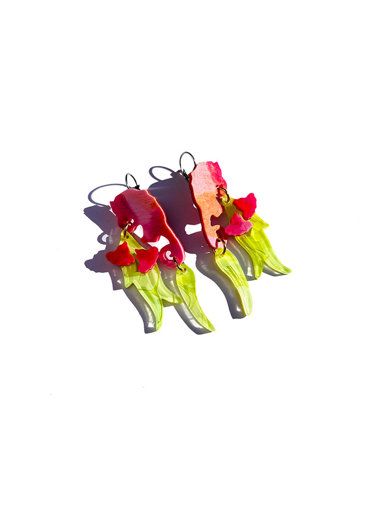 Our pieces are handcrafted from a range of mixed materials; hand poured resin, hand painted acrylics, matte silk finish acrylics, mineral acrylics, mirror, freshwater pearls, beads, faux leather tassels, silk tassels, brass, 18k gold plating.