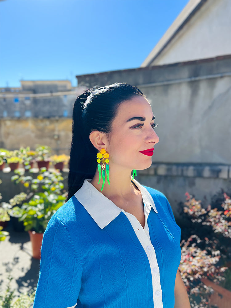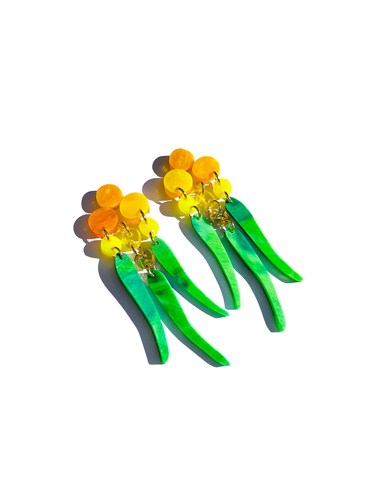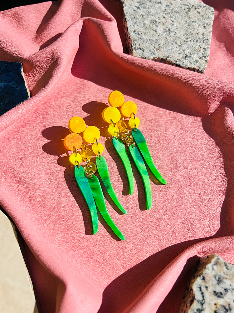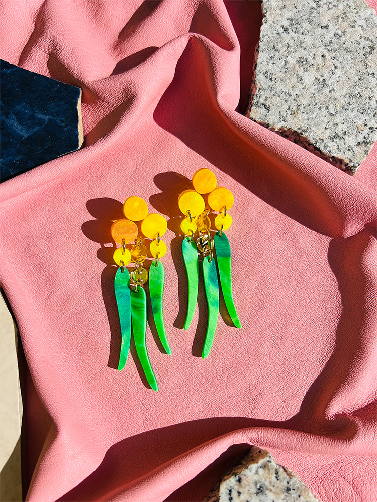 Our pieces are handcrafted from a range of mixed materials; hand poured resin, hand painted acrylics, matte silk finish acrylics, mineral acrylics, mirror, freshwater pearls, beads, faux leather tassels, silk tassels, brass, 18k gold plating.