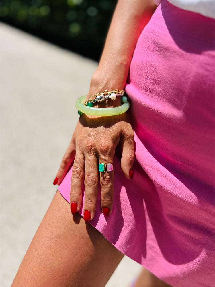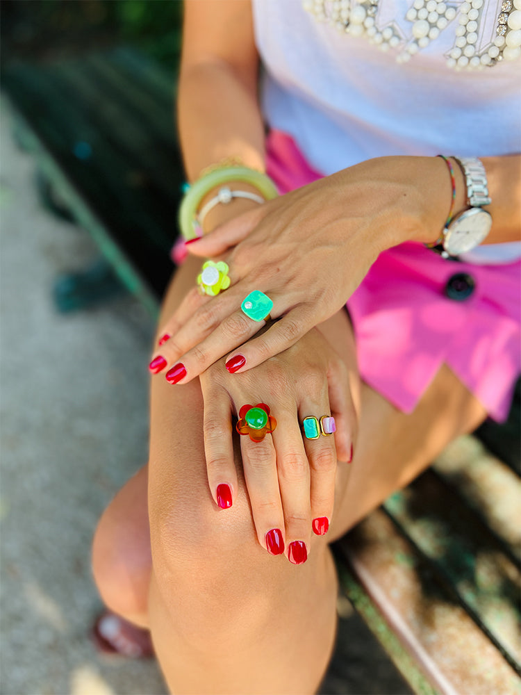 Our pieces are handcrafted from a range of mixed materials; hand poured resin, hand painted acrylics, matte silk finish acrylics, mineral acrylics, mirror, freshwater pearls, beads, faux leather tassels, silk tassels, brass, 18k gold plating.