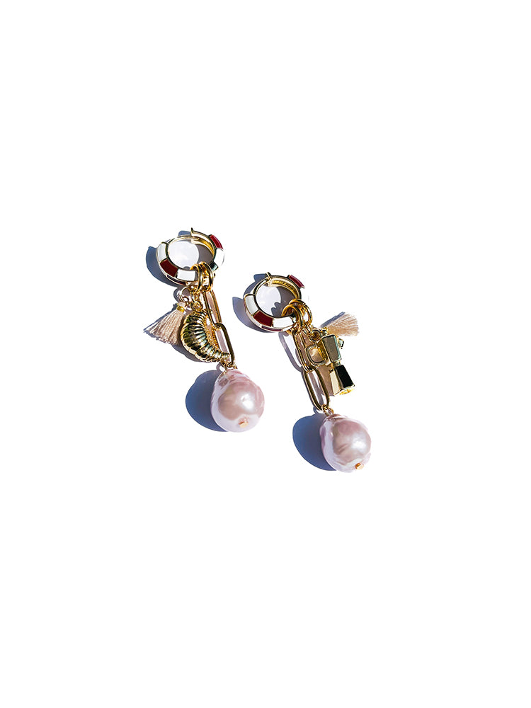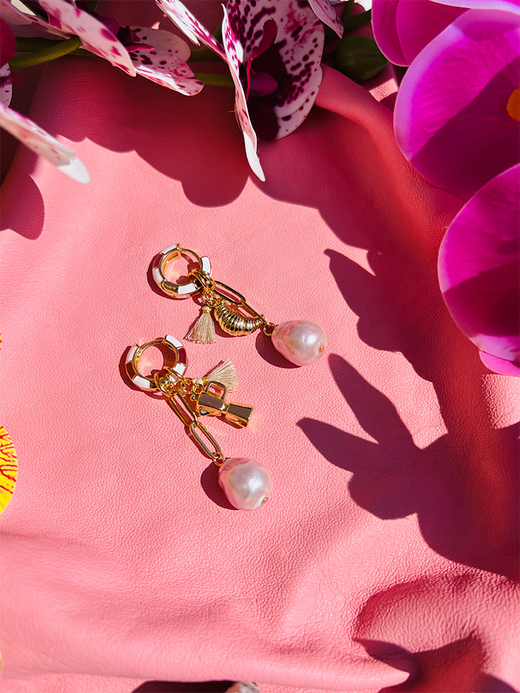 Materials; shell pearl, 18k gold plated breakfast charms; stainless steel chain; mini cotton tassels