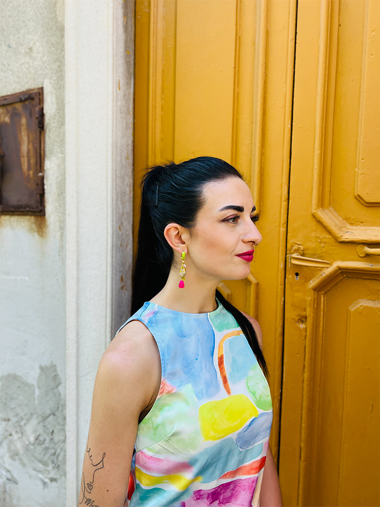 Our pieces are handcrafted from a range of mixed materials; hand poured resin, hand painted acrylics, matte silk finish acrylics, mineral acrylics, mirror, freshwater pearls, beads, faux leather tassels, silk tassels, brass, 18k gold plating.