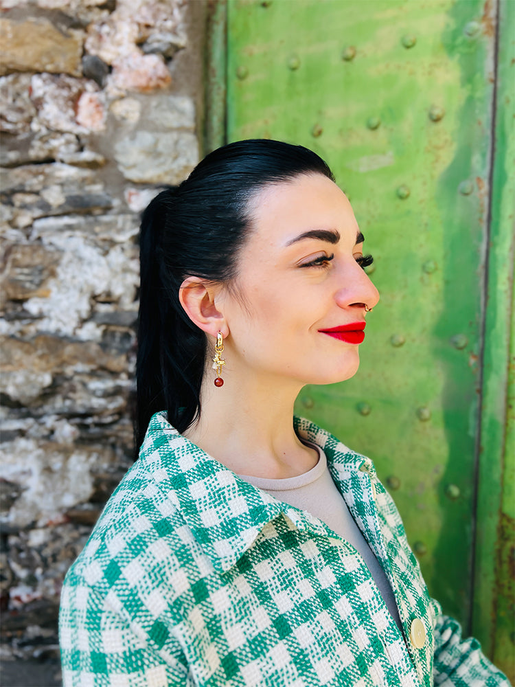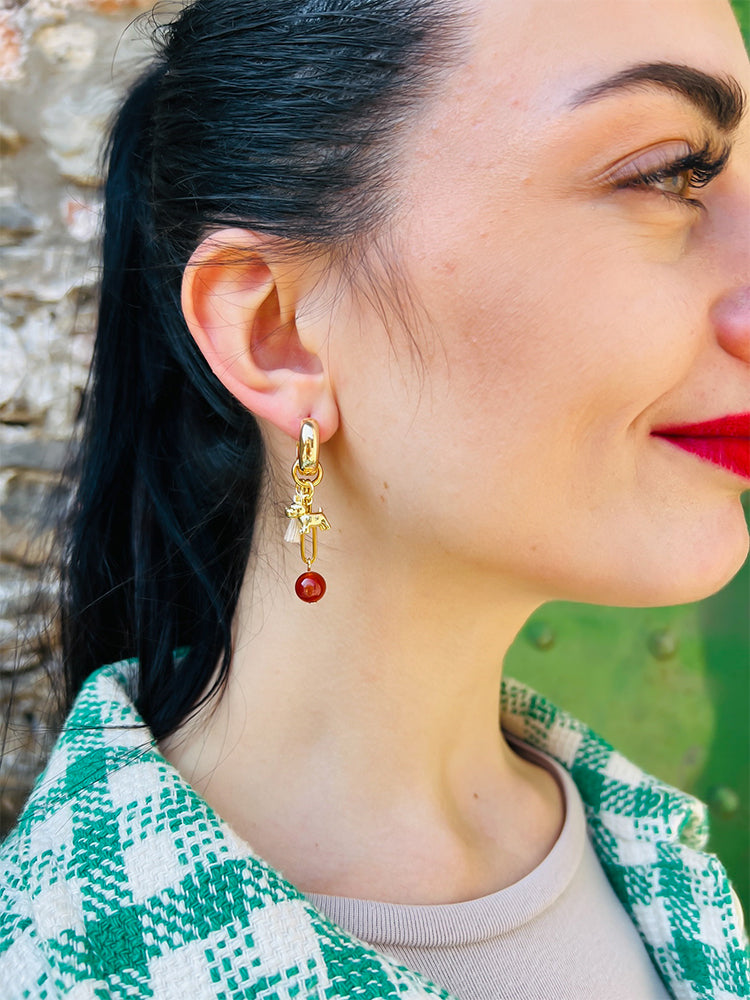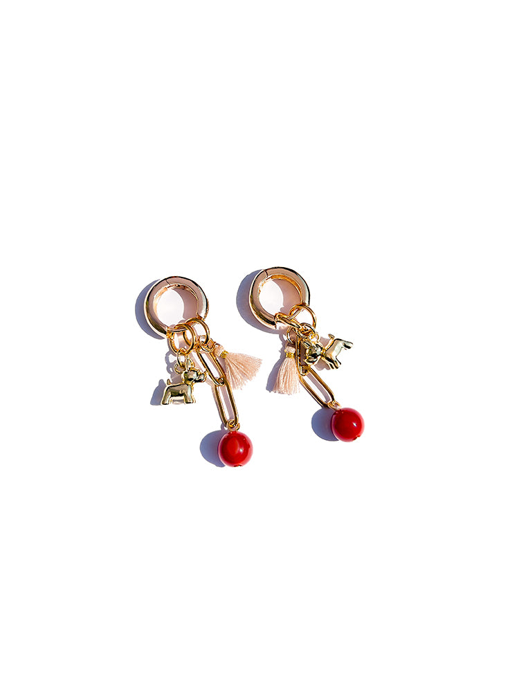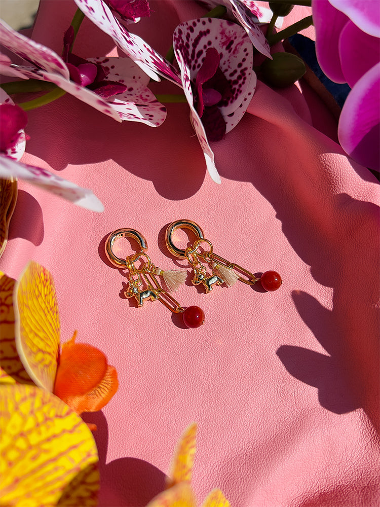 Materials; carnelian stone bead, 18k gold plated dog charm; stainless steel chain; mini cotton tassels