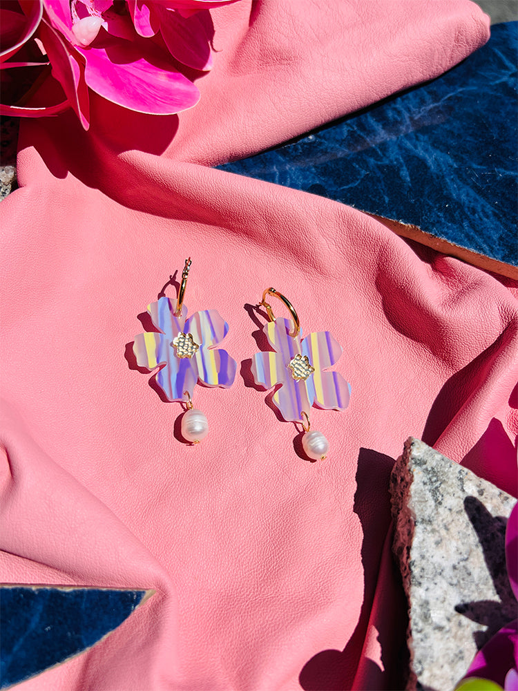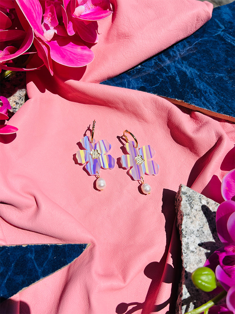 Our pieces are handcrafted from a range of mixed materials; hand poured resin, hand painted acrylics, matte silk finish acrylics, mineral acrylics, mirror, freshwater pearls, beads, faux leather tassels, silk tassels, brass, 18k gold plating.