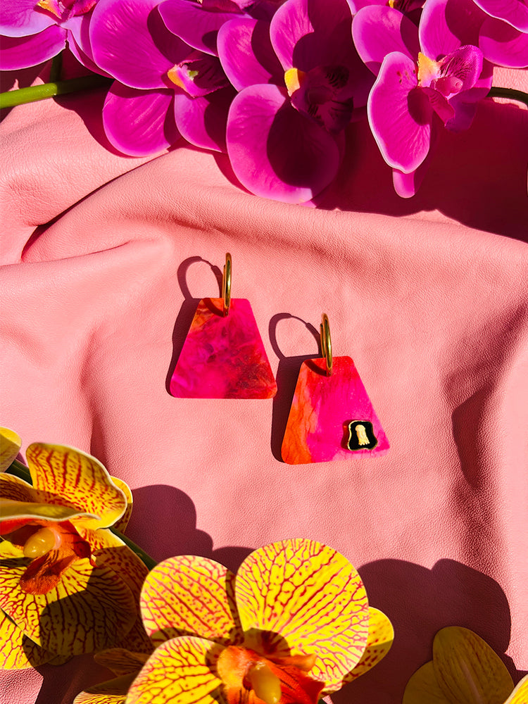 Our pieces are handcrafted from a range of mixed materials; hand poured resin, hand painted acrylics, matte silk finish acrylics, mineral acrylics, mirror, freshwater pearls, beads, faux leather tassels, silk tassels, brass, 18k gold plating.