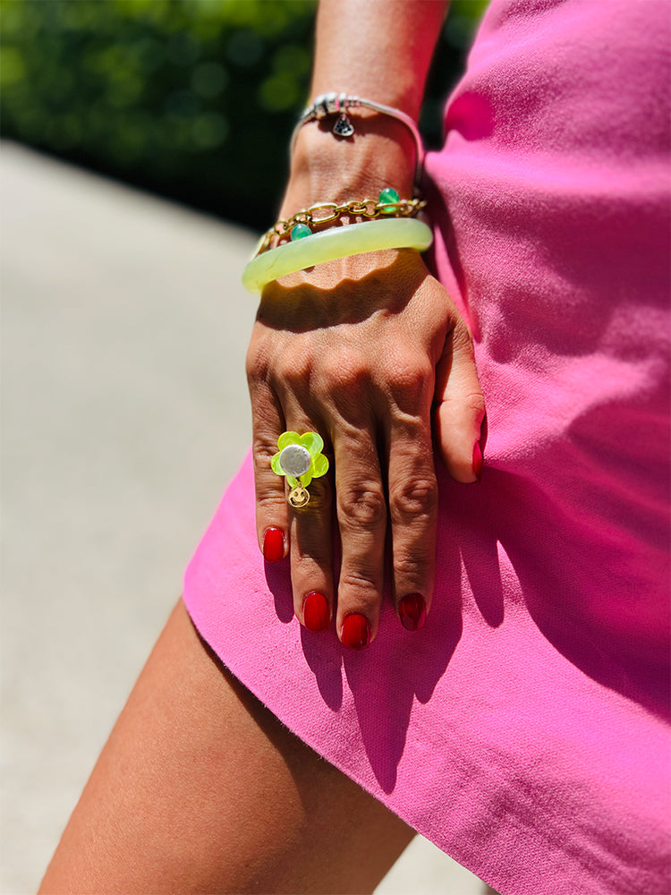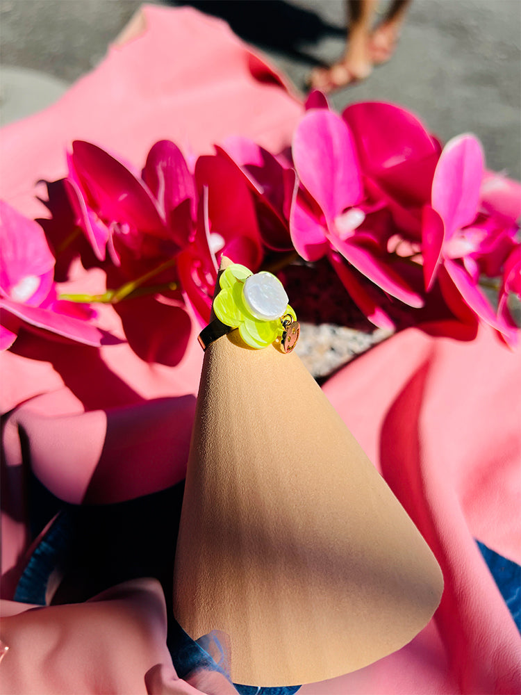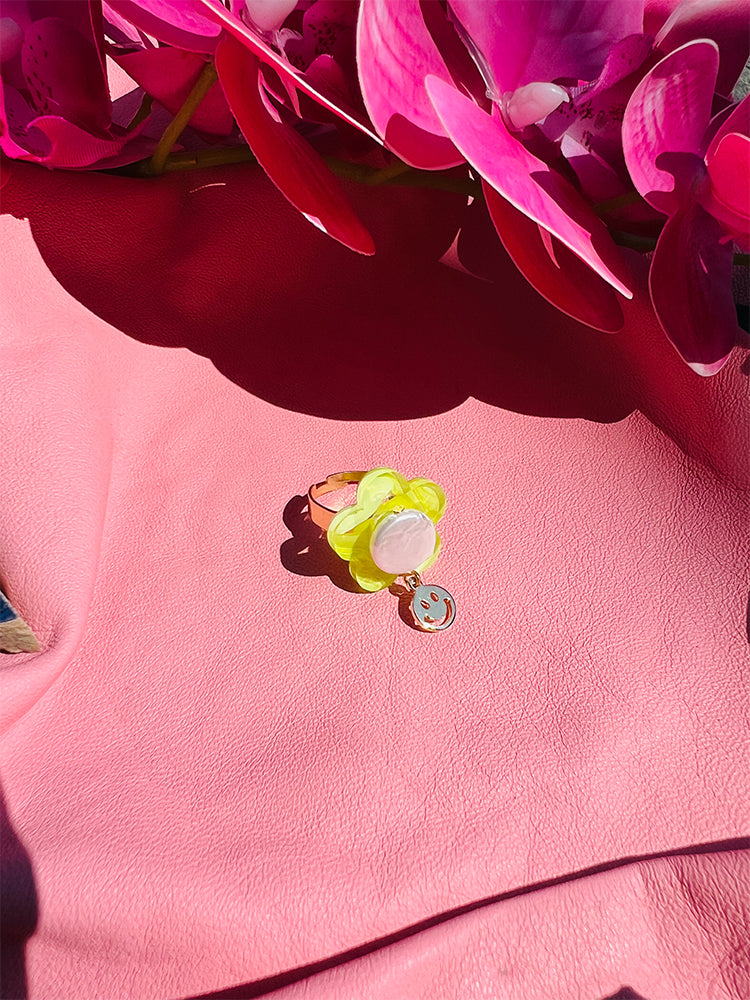 Smiley Bloom Ring | Lime Green Pearl | Adjustable Size