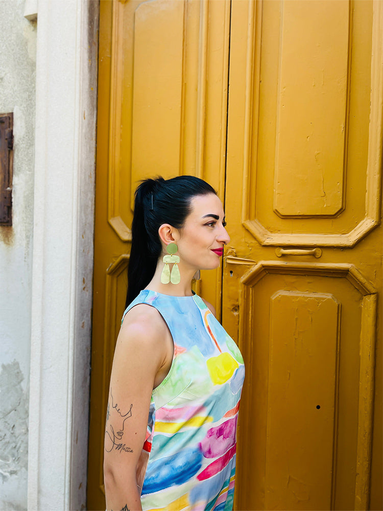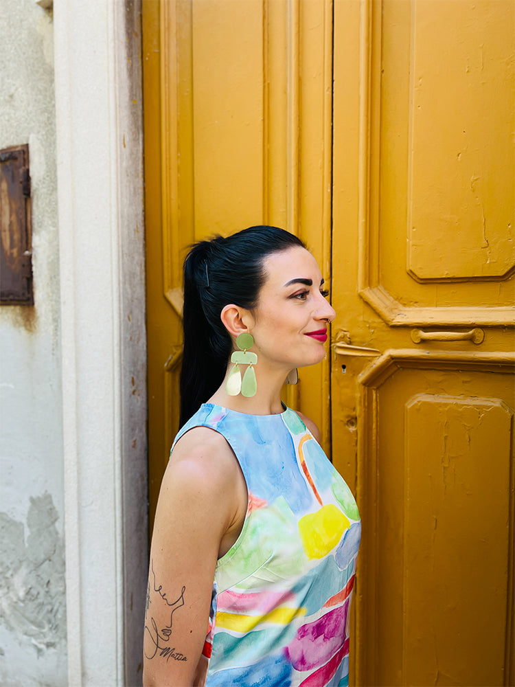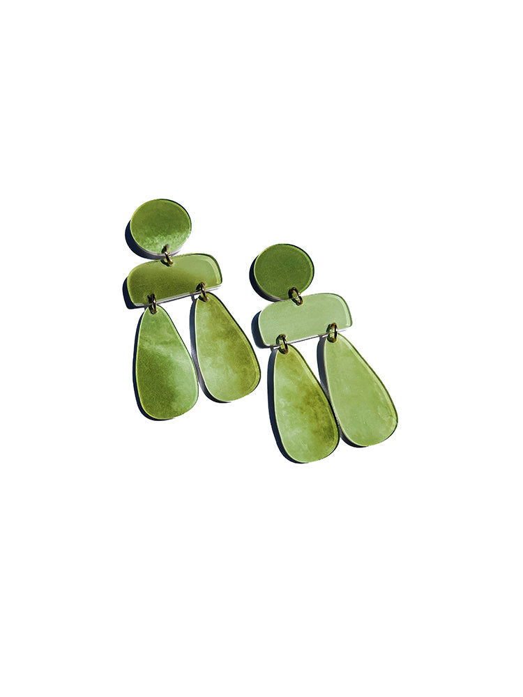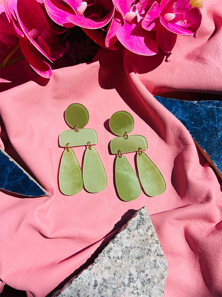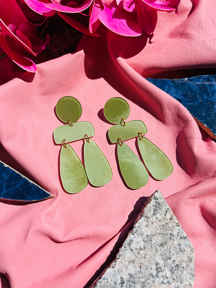 Our pieces are handcrafted from a range of mixed materials; hand poured resin, hand painted acrylics, matte silk finish acrylics, mineral acrylics, mirror, freshwater pearls, beads, faux leather tassels, silk tassels, brass, 18k gold plating.