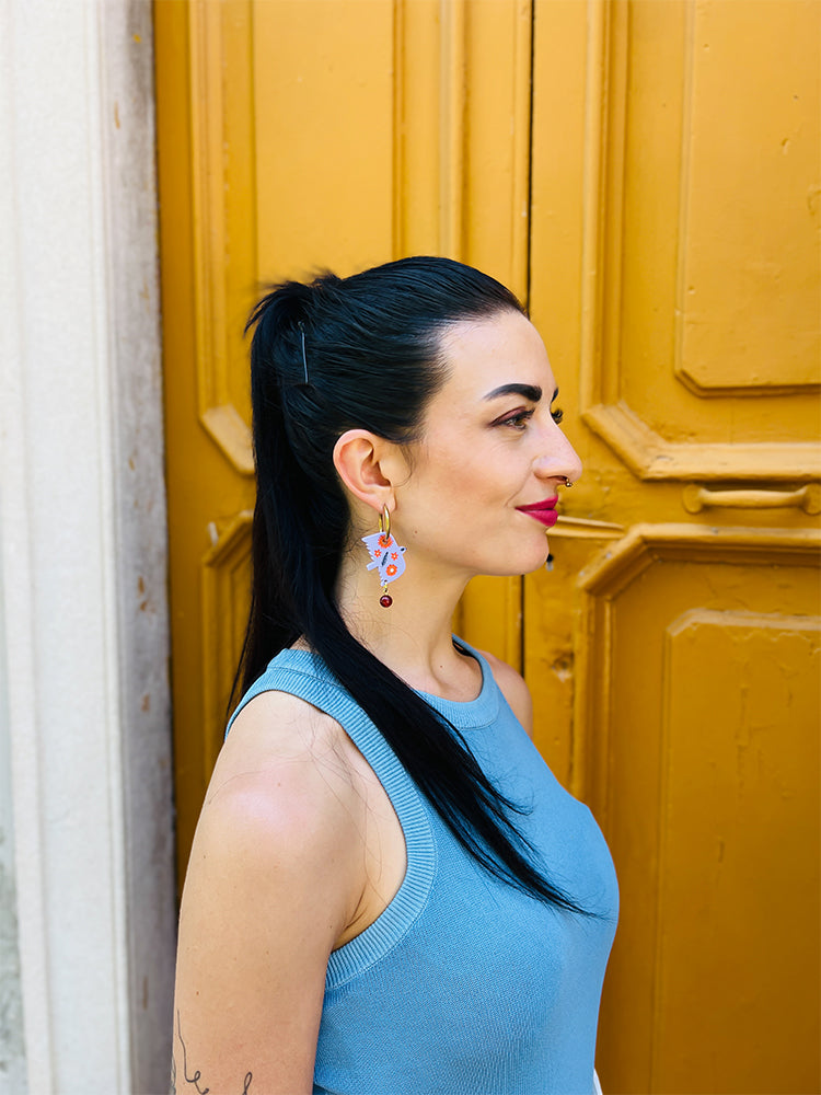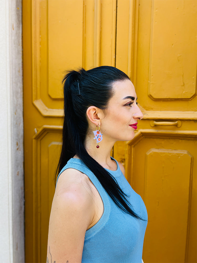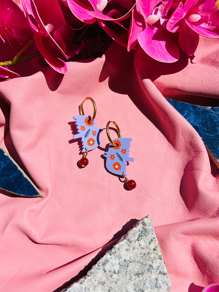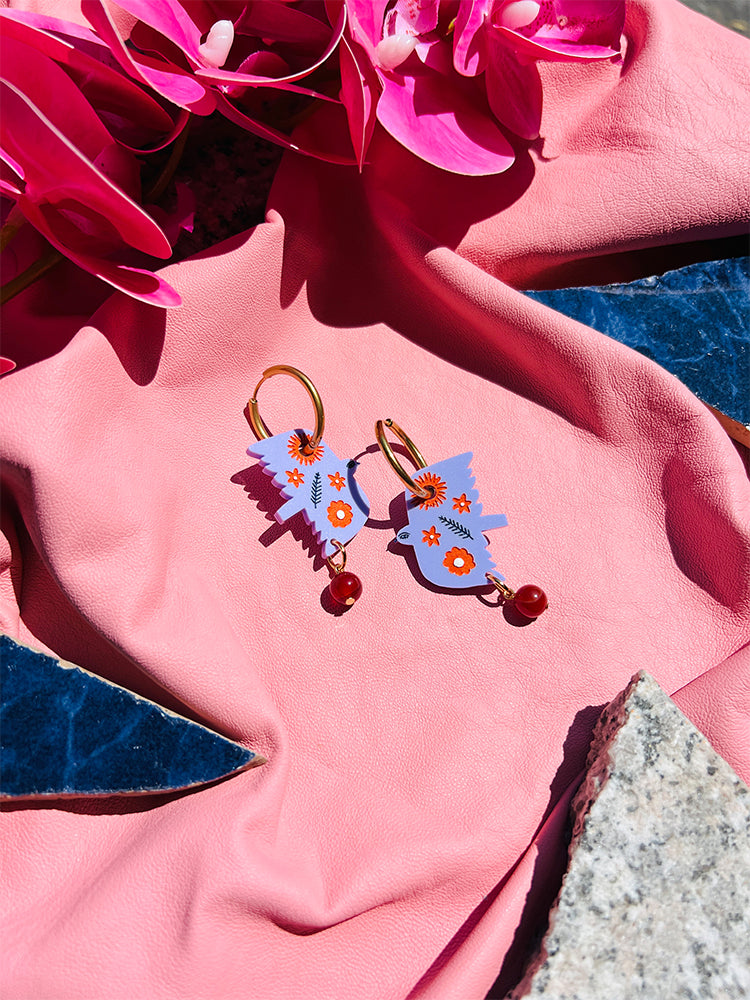 Our pieces are handcrafted from a range of mixed materials; hand poured resin, hand painted acrylics, matte silk finish acrylics, mineral acrylics, mirror, freshwater pearls, beads, faux leather tassels, silk tassels, brass, 18k gold plating.