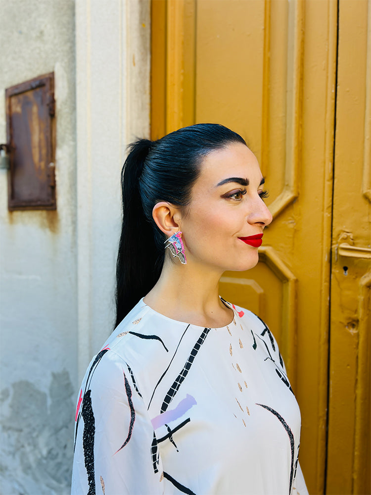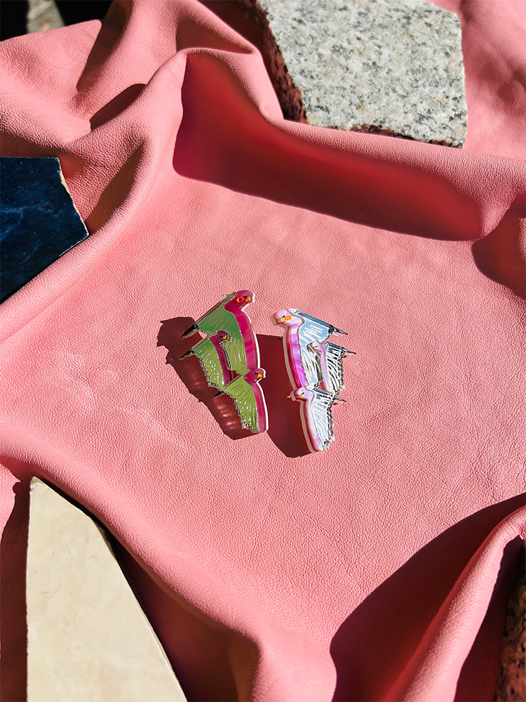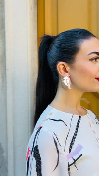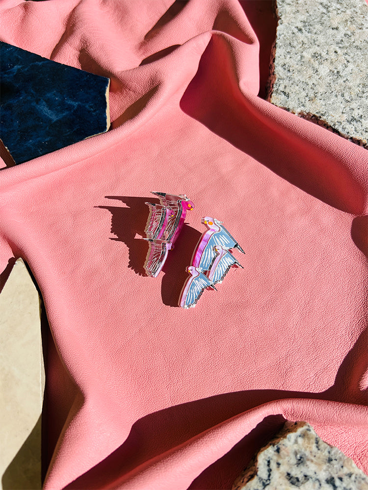 Our pieces are handcrafted from a range of mixed materials; hand poured resin, hand painted acrylics, matte silk finish acrylics, mineral acrylics, mirror, freshwater pearls, beads, faux leather tassels, silk tassels, brass, 18k gold plating.