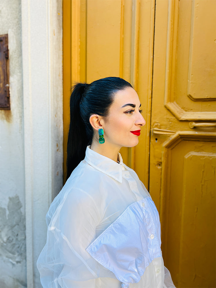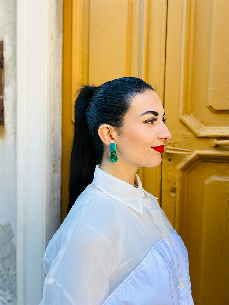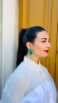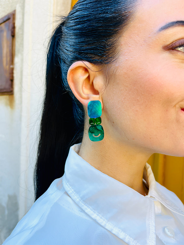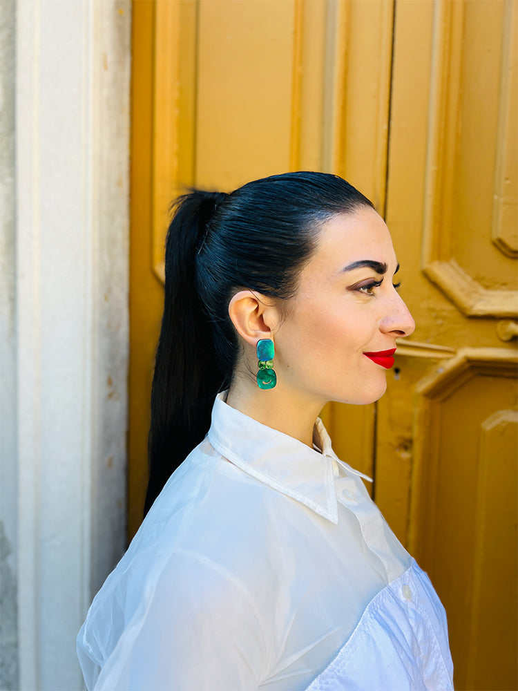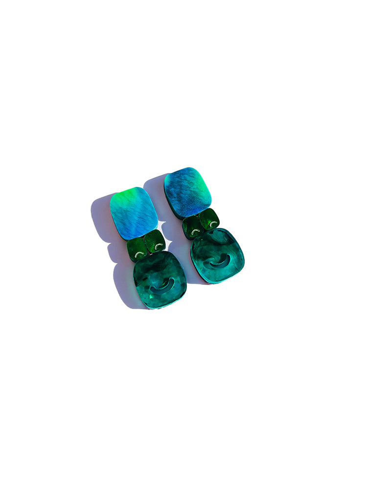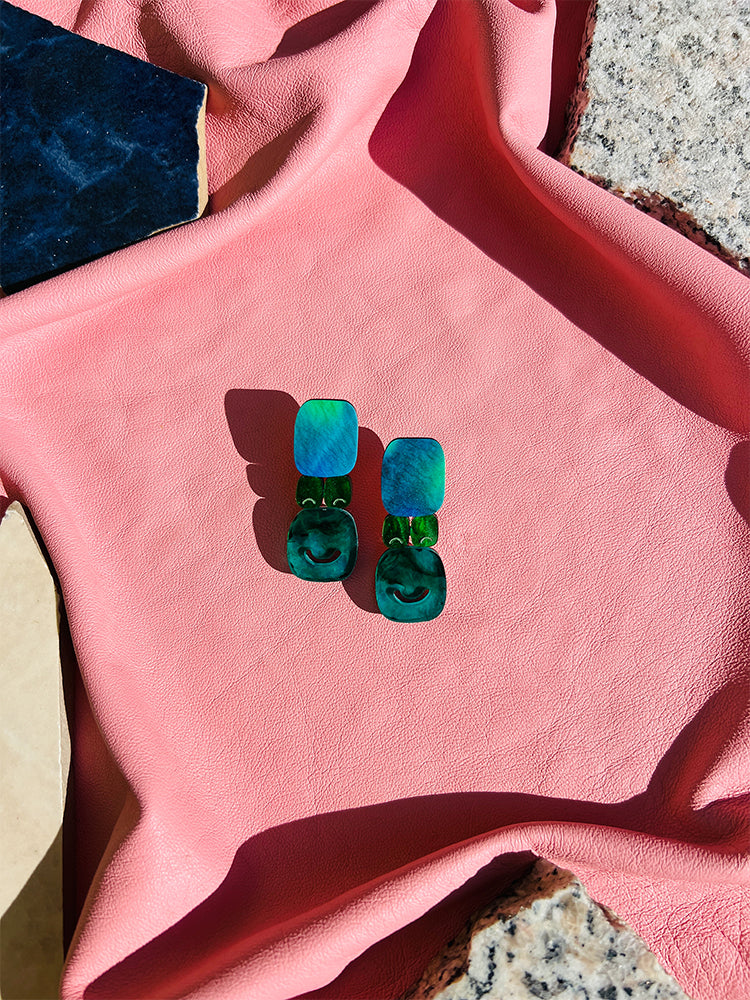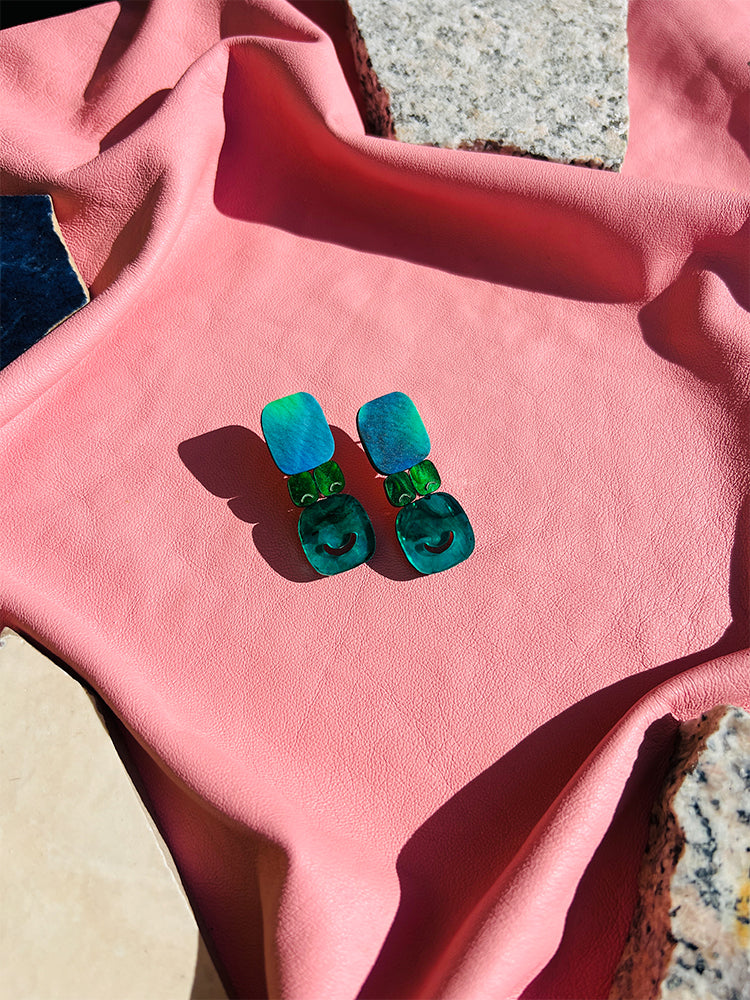 Our pieces are handcrafted from a range of mixed materials; hand poured resin, hand painted acrylics, matte silk finish acrylics, mineral acrylics, mirror, freshwater pearls, beads, faux leather tassels, silk tassels, brass, 18k gold plating.