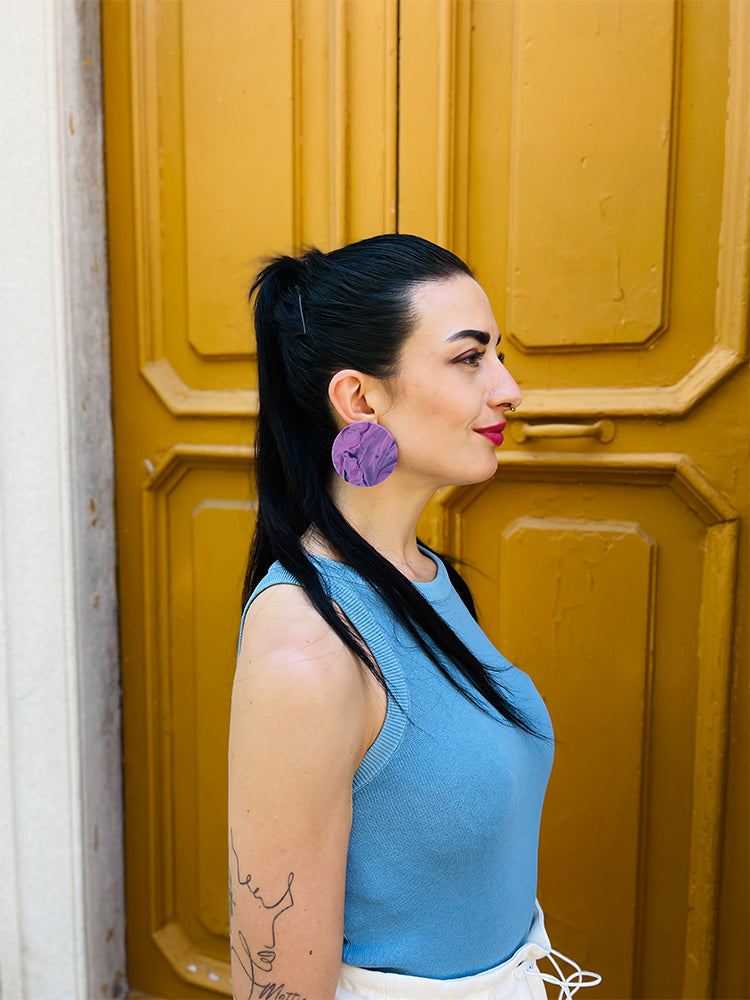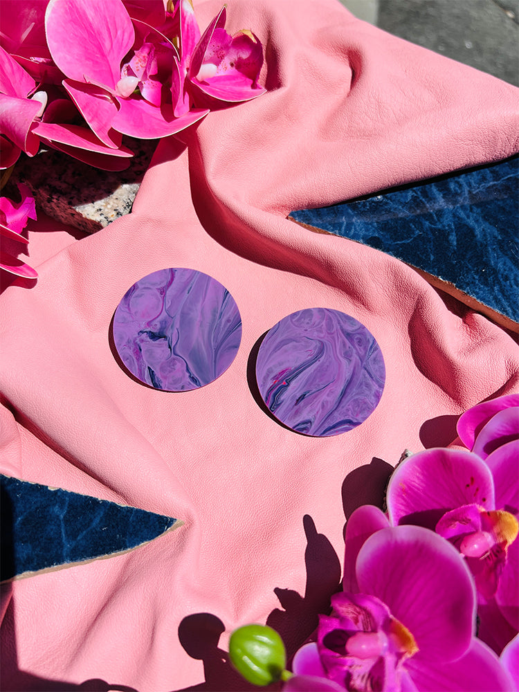Our pieces are handcrafted from a range of mixed materials; hand poured resin, hand painted acrylics, matte silk finish acrylics, mineral acrylics, mirror, freshwater pearls, beads, faux leather tassels, silk tassels, brass, 18k gold plating.