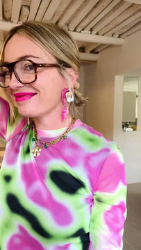 Our pieces are handcrafted from a range of mixed materials; hand poured resin, hand painted acrylics, matte silk finish acrylics, mineral acrylics, mirror, freshwater pearls, beads, faux leather tassels, silk tassels, brass, 18k gold plating.